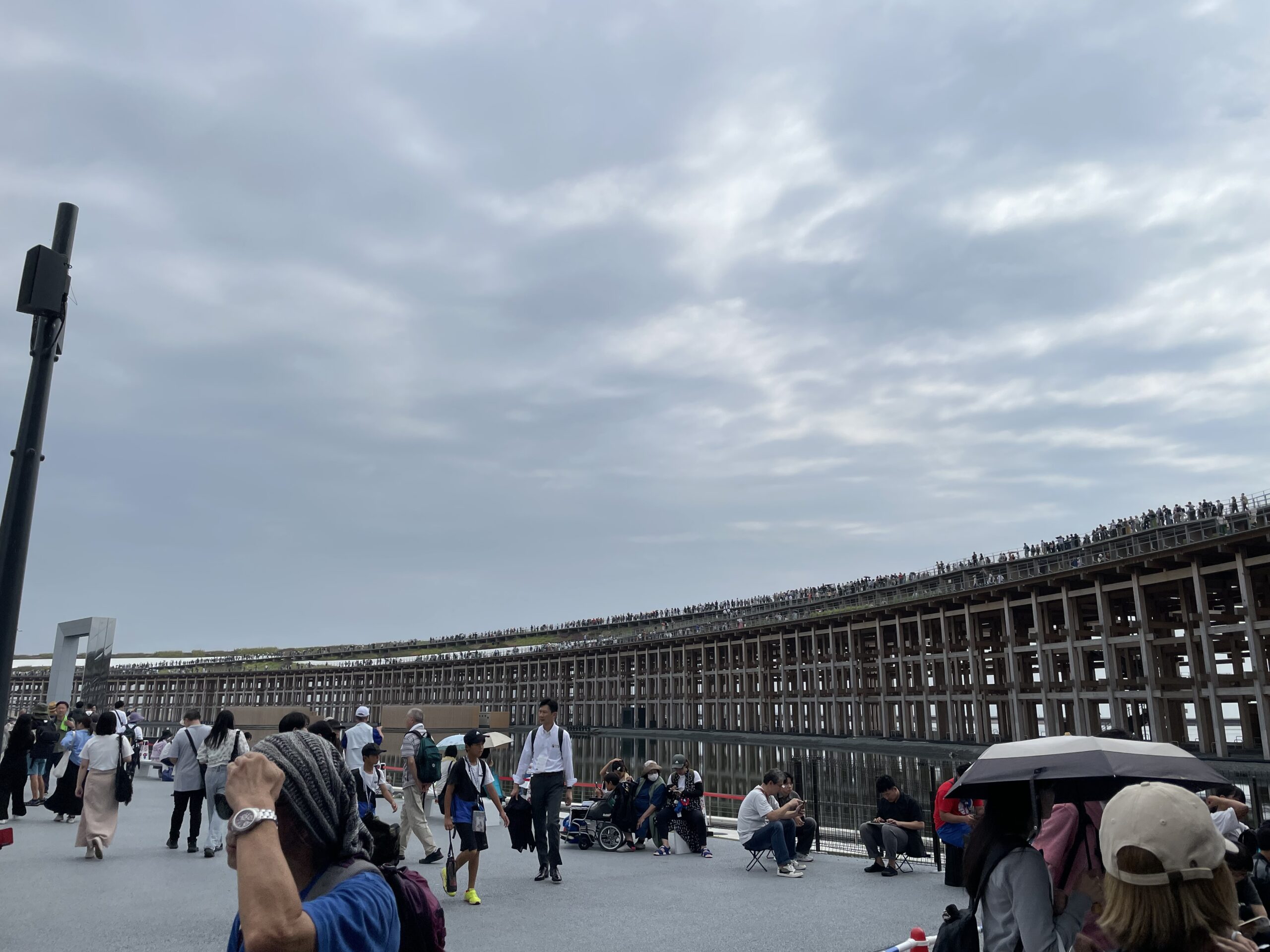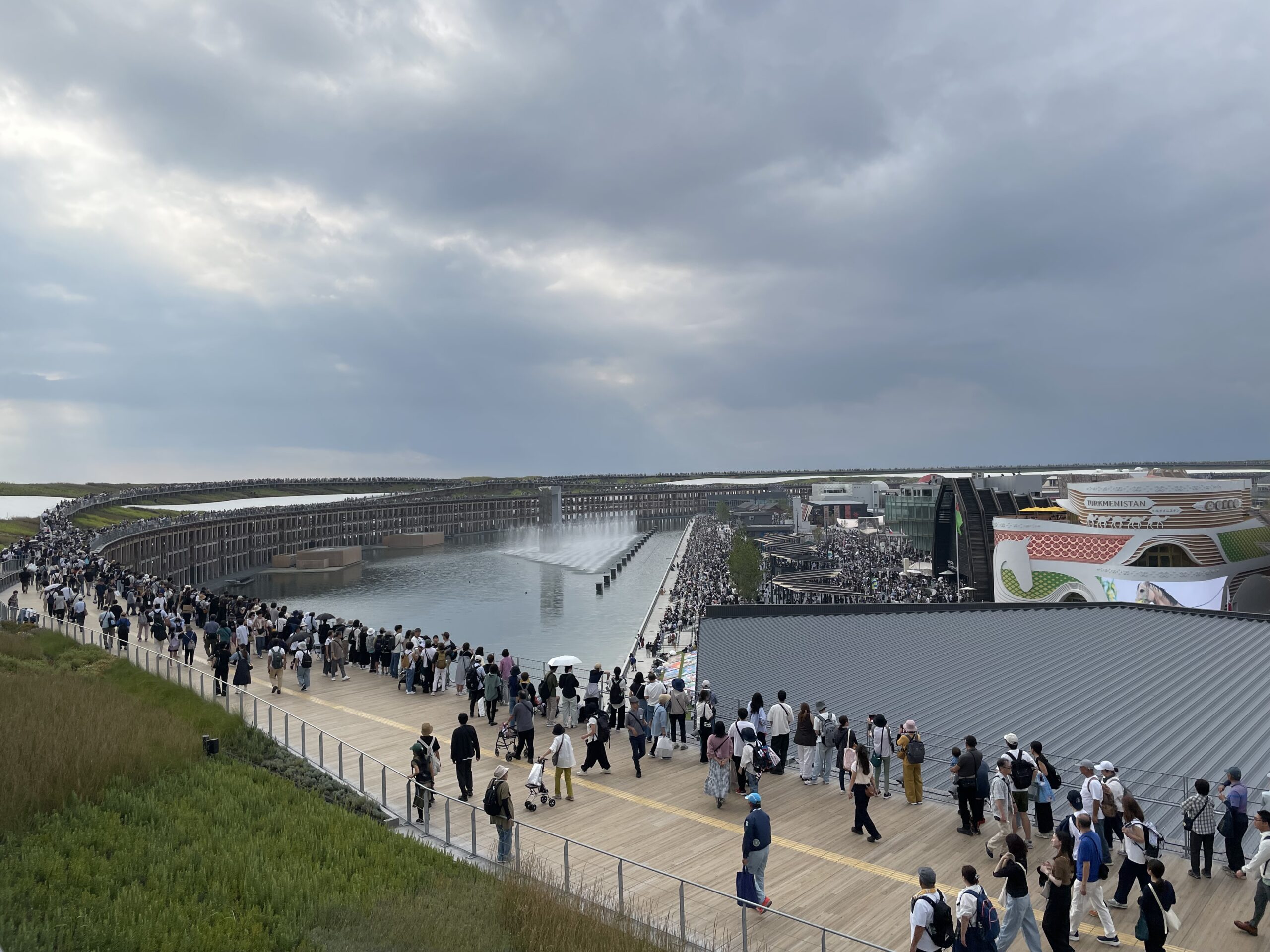 とにかくすごい人で飲食店もいっぱいで、大屋根リングの上もこのように人であふれています。
